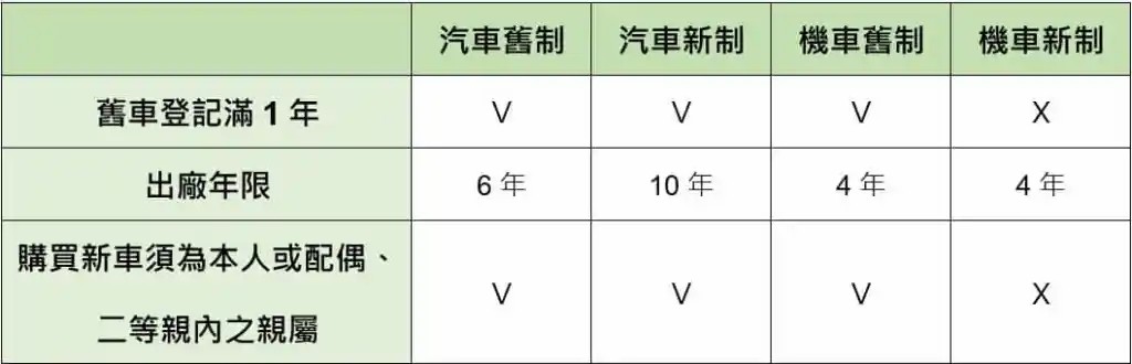 - 汽車車種:並不是所有的汽車車種都適用汰舊換新的資格,僅有小客車、小貨車、小客貨兩用車適用。